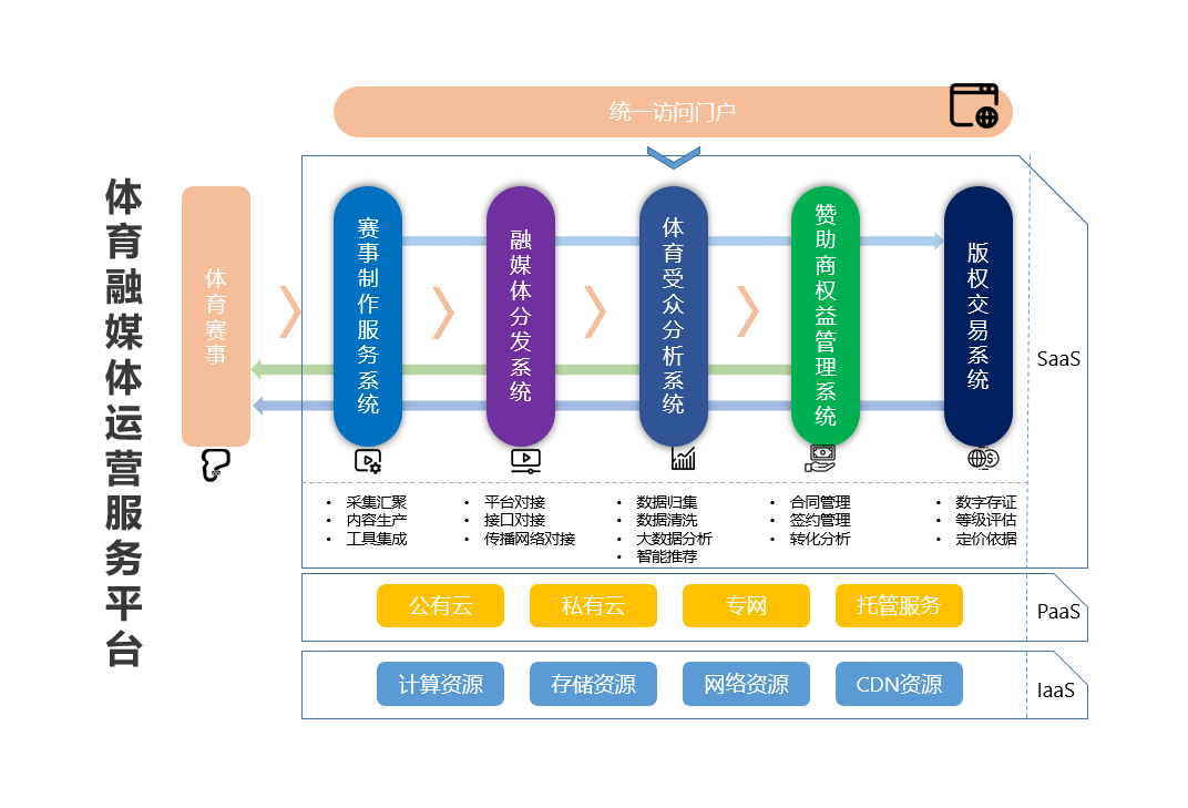 “体育融媒体运营服务平台“服务于各个体育协会、赛事主办方,对接赛事举办过程中所需商业资源,从赛事信息传达、消息下发、赛事举办、商业赞助、赛事制作、版权交易等环节入手,力争打造一套符合体育产业业态的端到端整体平台级解决方案。